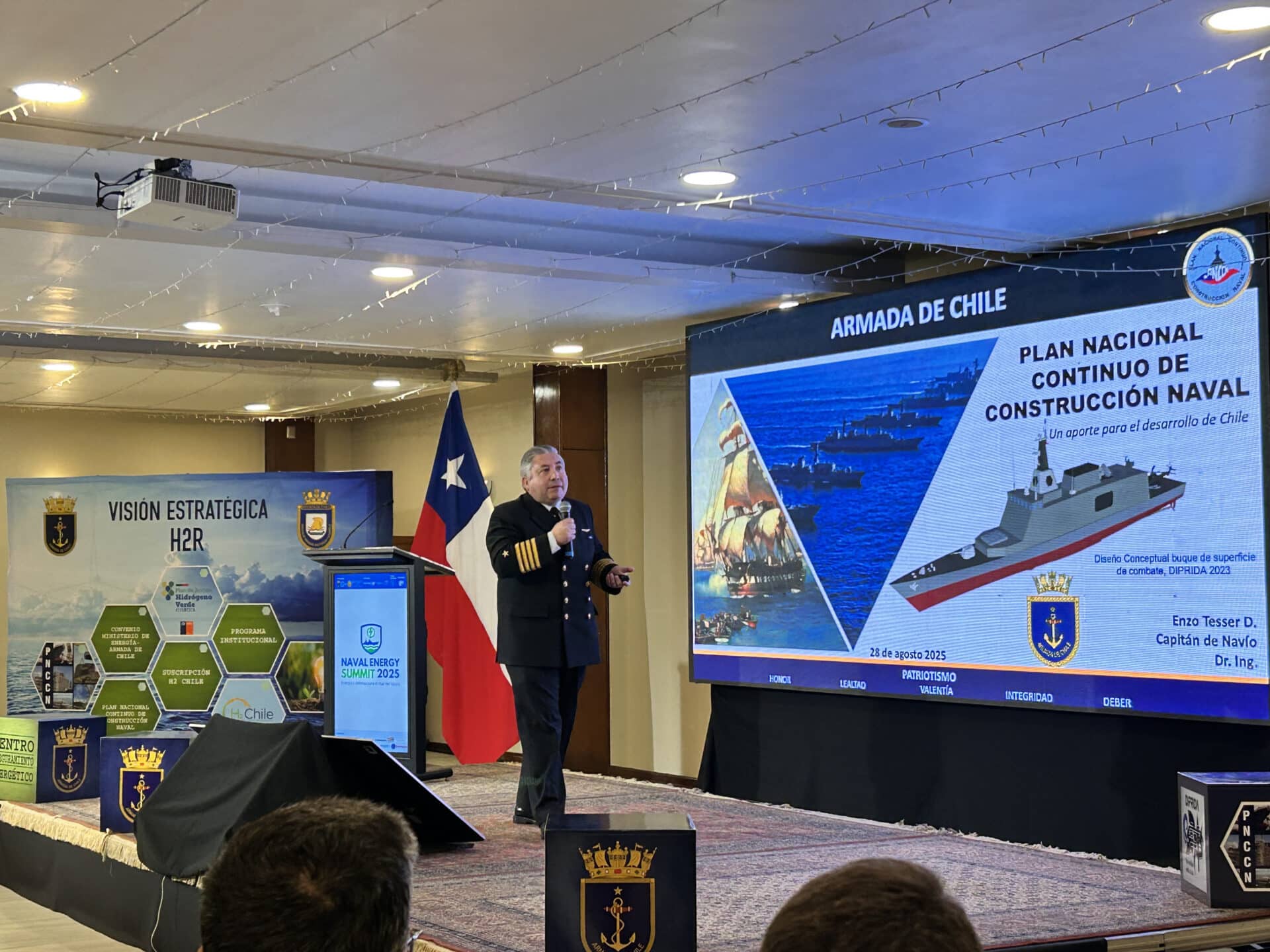 Valparaíso, 28 de agosto de 2025.- Con la participación de más de 400 asistentes presenciales y transmisión vía streaming en las redes oficiales de la Armada de Chile, se desarrolló el Naval Energy Summit 2025, realizado en el Club Naval de Valparaíso, siendo el primer encuentro internacional que integra defensa, energía y sostenibilidad para proyectar el futuro marítimo del país y la región.